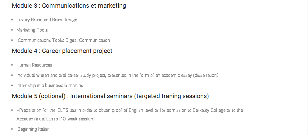 此项目分为5个模块。模块的设置从奢侈品与时尚的历史、文化到市场传播,再到人力资源和职业规划,甚至还提供语言课程的选修。